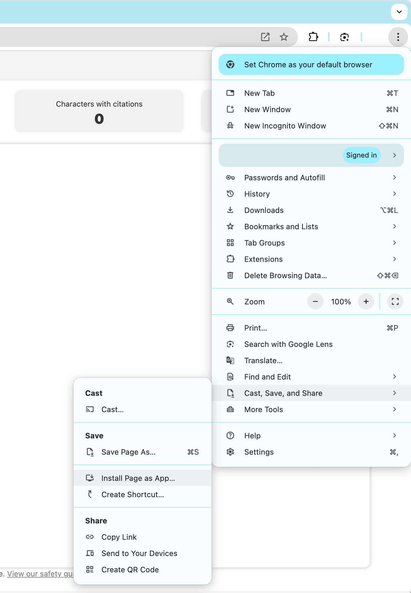 To install CiteCount on your device through Google Chrome, click the hamburger menu (3 dots) next to the search bar, click Cast, Save, and Share, then click Install Page as App.