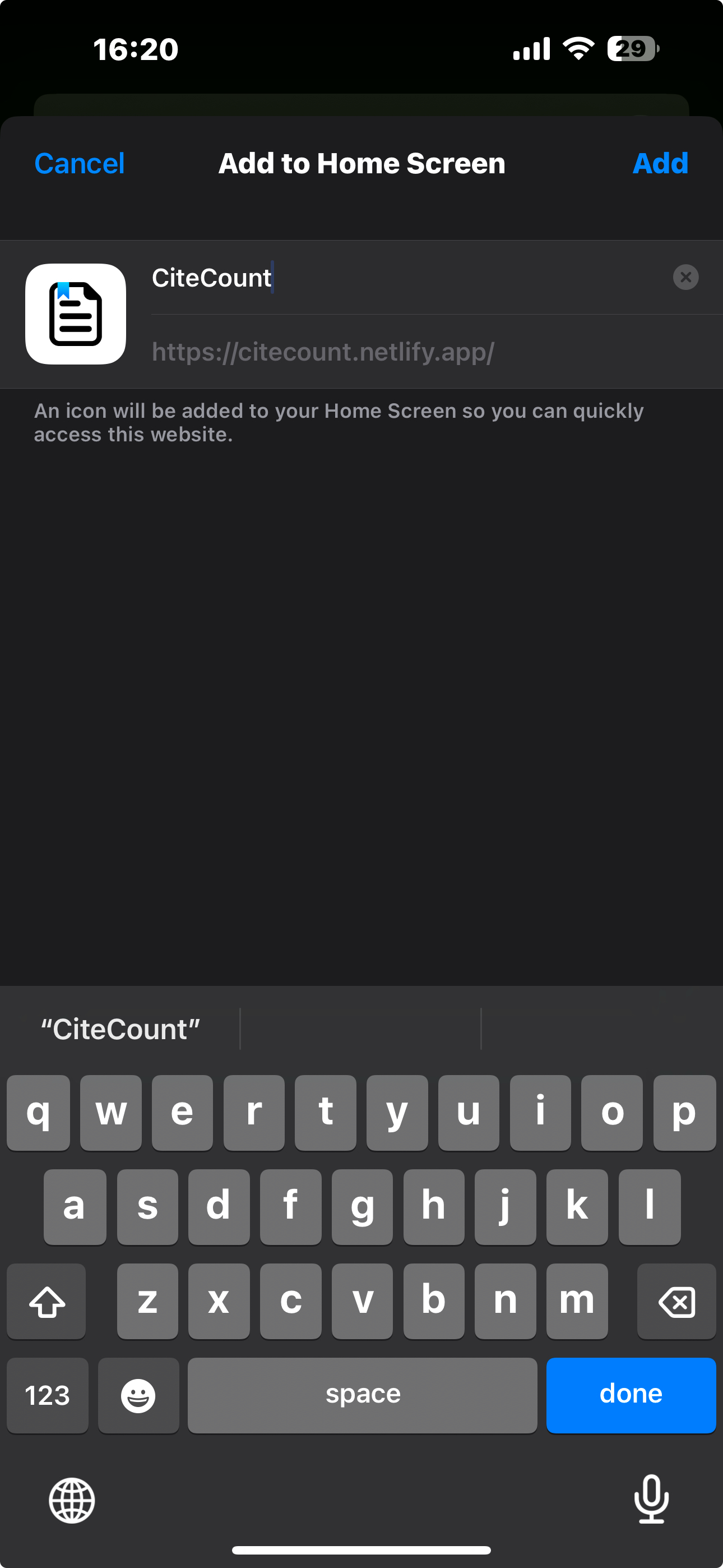 To install CiteCount on your device through Safari on your iPhone, click the share button, then click Add to Home Screen.