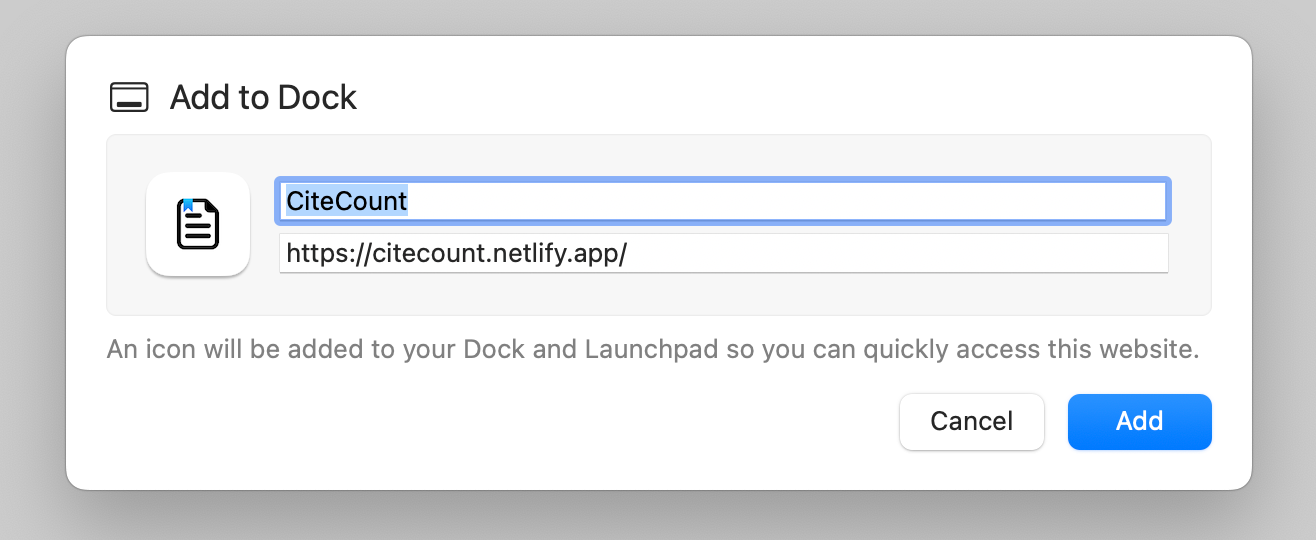CiteCount is available as a web application on citecount.netlify.app. Alternatively, it could be downloaded on your device for offline use. Follow the guide below to download CiteCount with your prefered browser. If your browser is not listed, please search for information on how to download a web application for your browser.