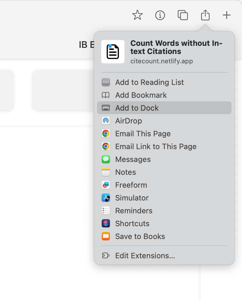 To install CiteCount on your device through Safari, click the share button next to the search bar, then click Add to Dock.